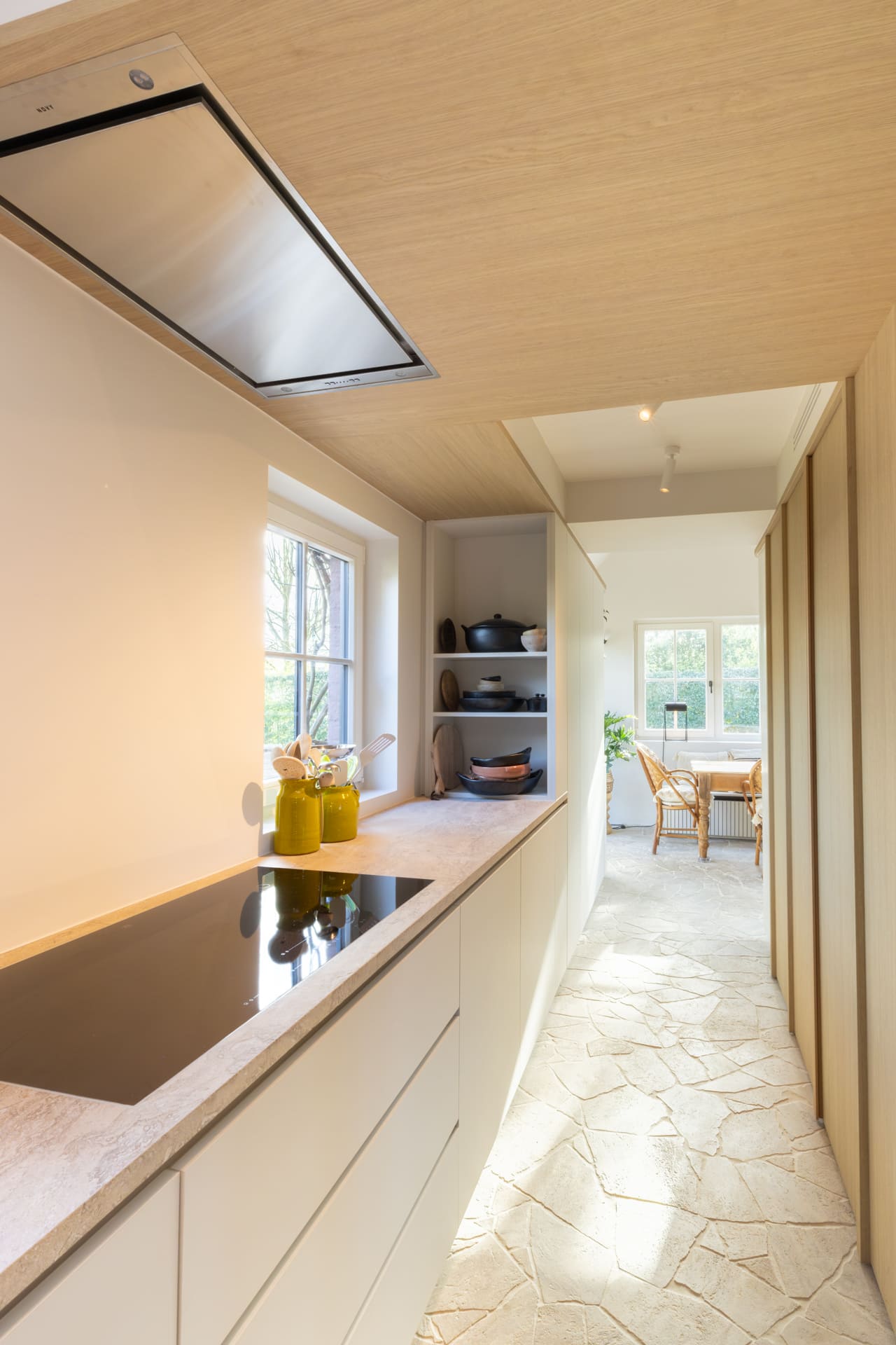 De keuken werd ontworpen met een sterke focus op rust en eenheid. Door het ontwerp volledig door te trekken in materialen en lijnen ontstaat een strak en tijdloos geheel.